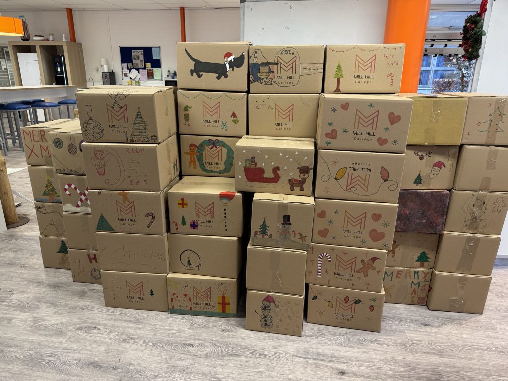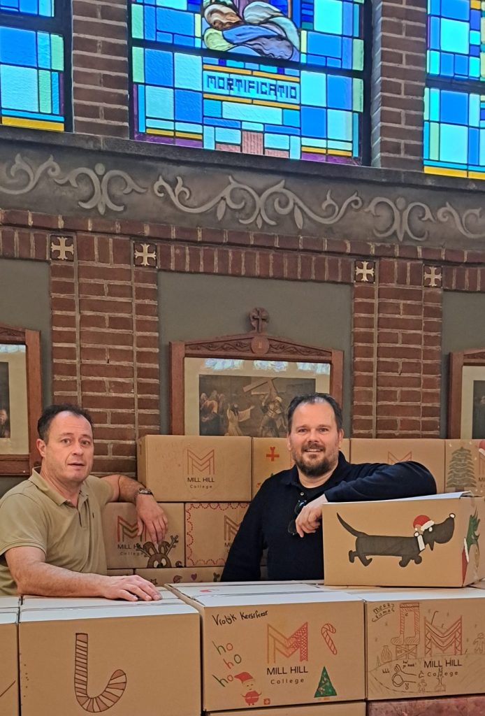 Vandaag zijn de pakketten overgedragen aan Dorpsteam Goirle. Het Dorpsteam deelt de pakketten morgen uit aan bewoners van de gemeente Goirle die daarvoor in aanmerking komen. Zij kunnen in het Jan van Besouwhuis verschillende producten uitzoeken die het Dorpsteam zelf heeft ingezameld en krijgen dan als ‘kers op de taart’ een kerstpakket van het Mill Hill College mee.